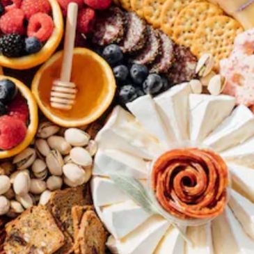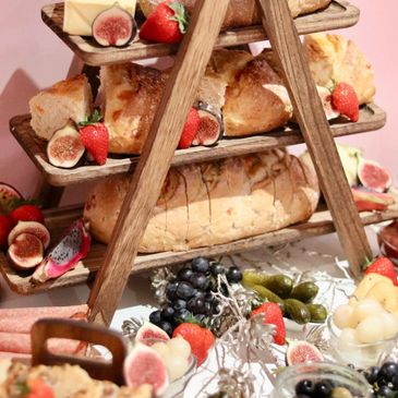 A beautiful spread of food that has been styled to look just as good as it tastes! You will be treated to a selection of cheeses and meats, as well as seasonal fruits and crudites, dips, and more! The food is styled with foliage and stands of different heights to make the food stand out.